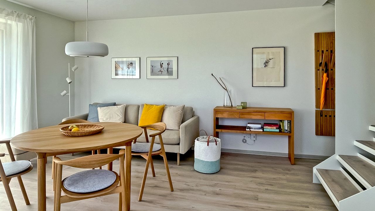 Der Eingang zur Wohnung befindet sich an der Nordseite des Hauses, und man kann sowohl von dort als auch aus dem Wohn- und Esszimmer mit Küche auf den großzügigen Holzumlauf des Hauses und in den Garten treten, um sich an einem der beiden Orte auf den jeder Ferienwohnung zur Verfügung stehenden Gartenmöbeln niederzulassen.
